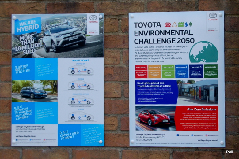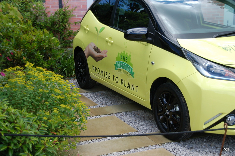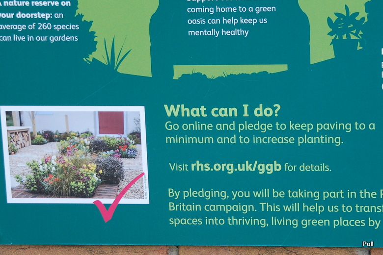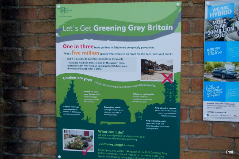 W innym miejscu przedstawiono przykład zagospodarowania przestrzeni przed domem, by godziła obie funkcje- miejsca parkingowego i minimalnego, ale jednak zielonego miejsca , namiastki przedogródka. Bijący na alarm plakat aż krzyczy, że przestrzenie przed domami stały się w Brytanii szare i wybetonowane...