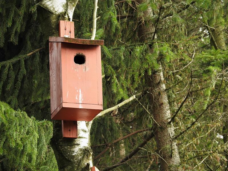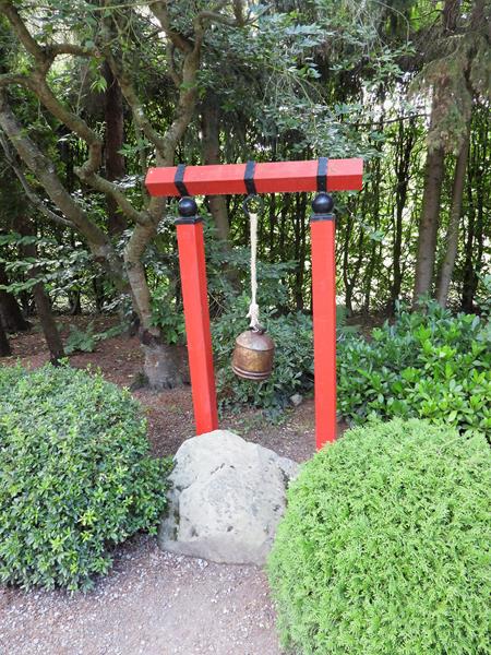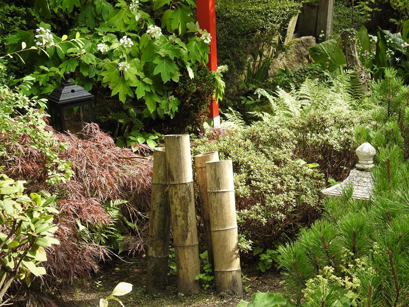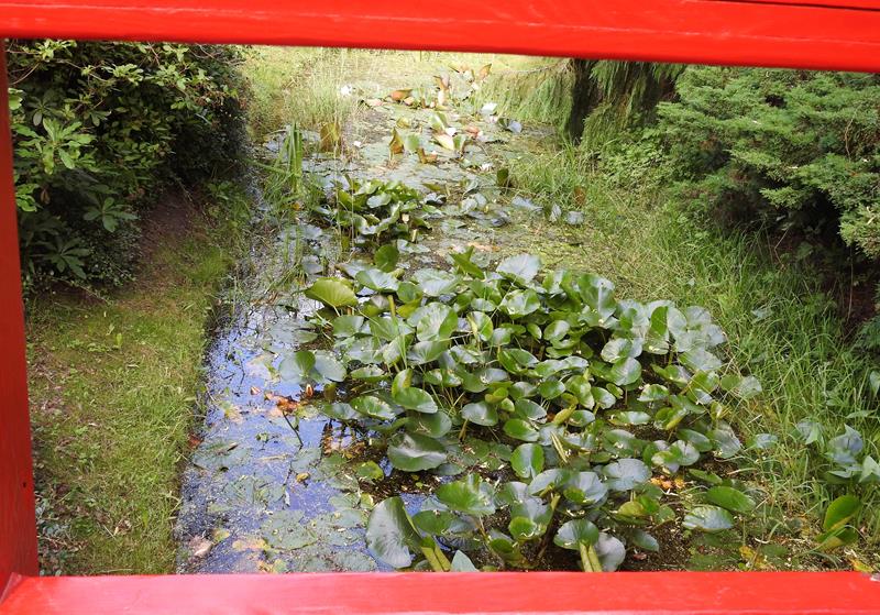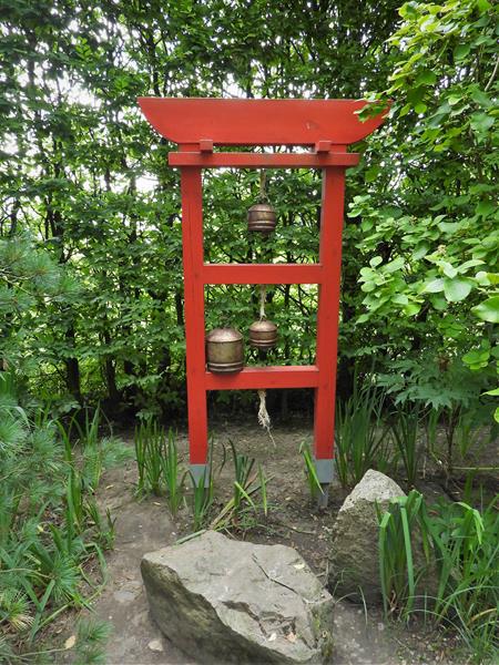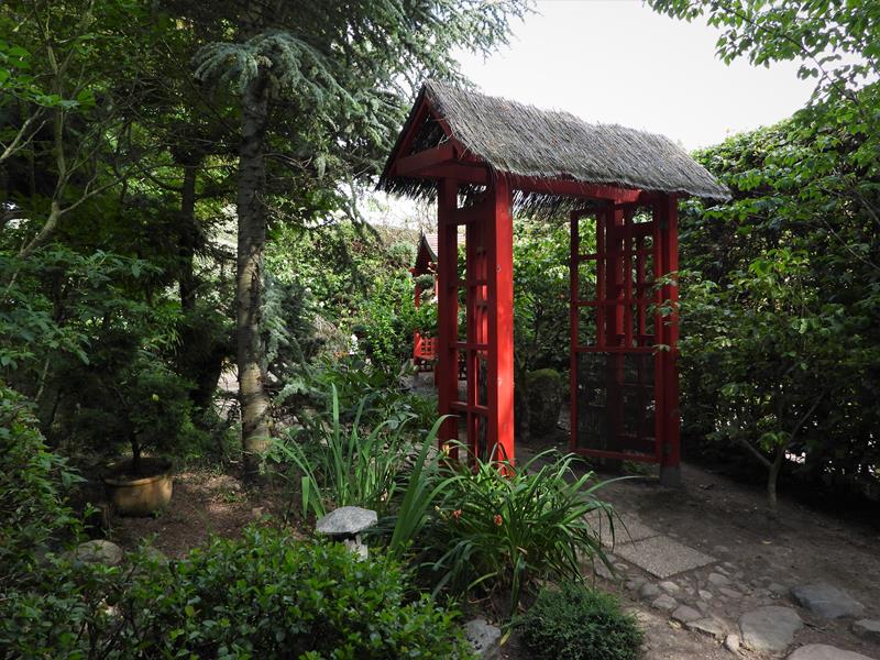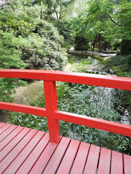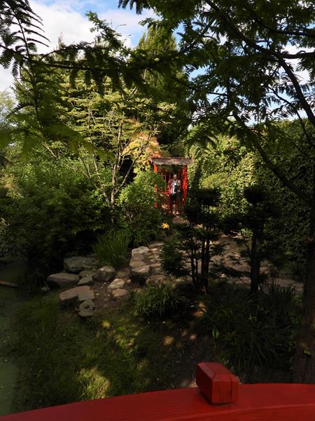 Wszystkie drewniane ozdoby w japońskim ogrodzie są w jaskrawo czerwonym kolorze.