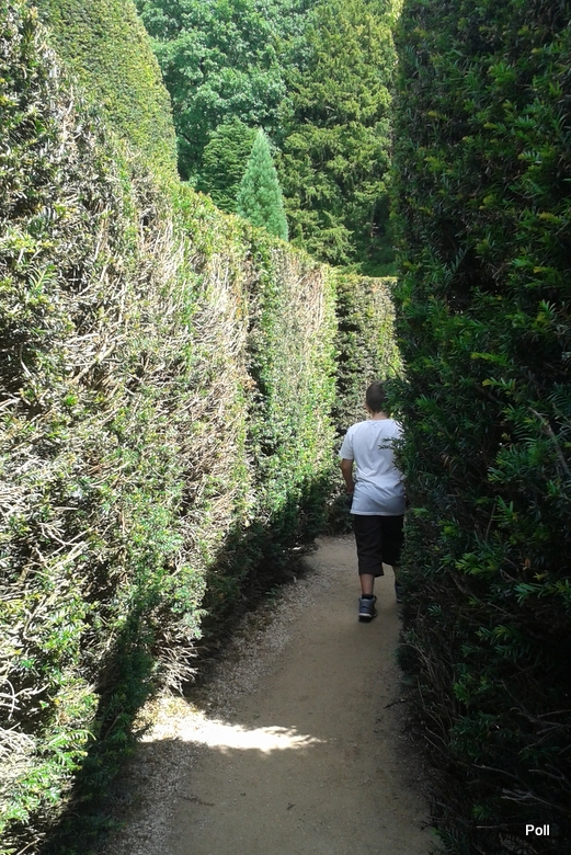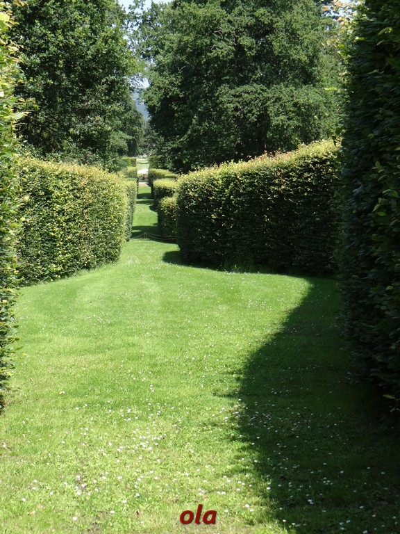 Idealnie utrzymane trawniki a strzyżone żywopłoty z wysokich krzewów tworzą labirynt .
