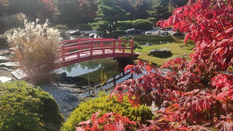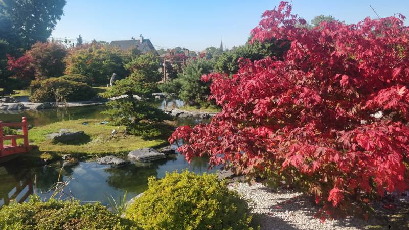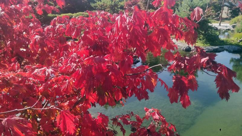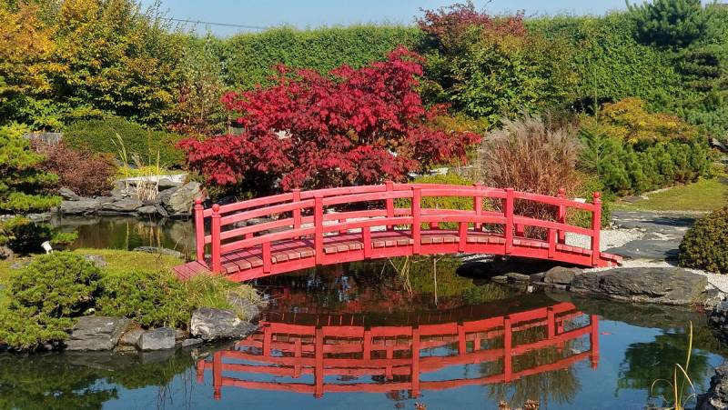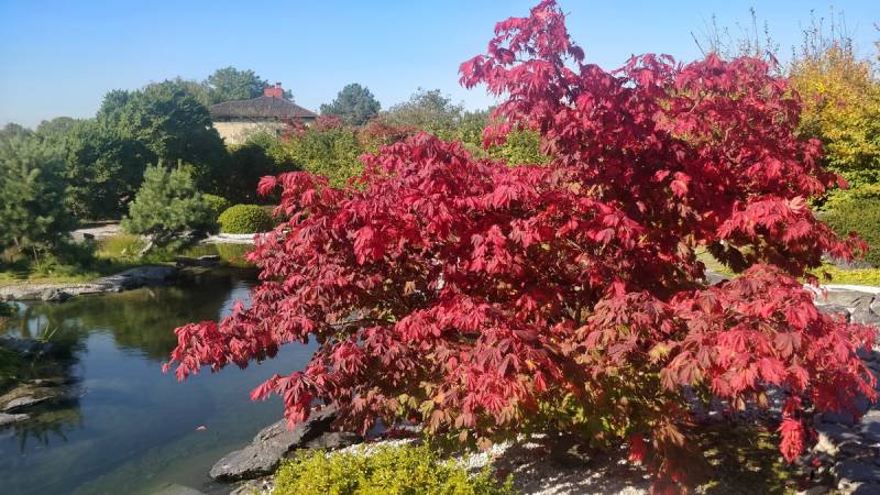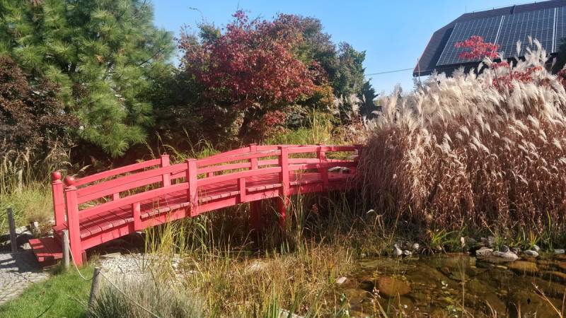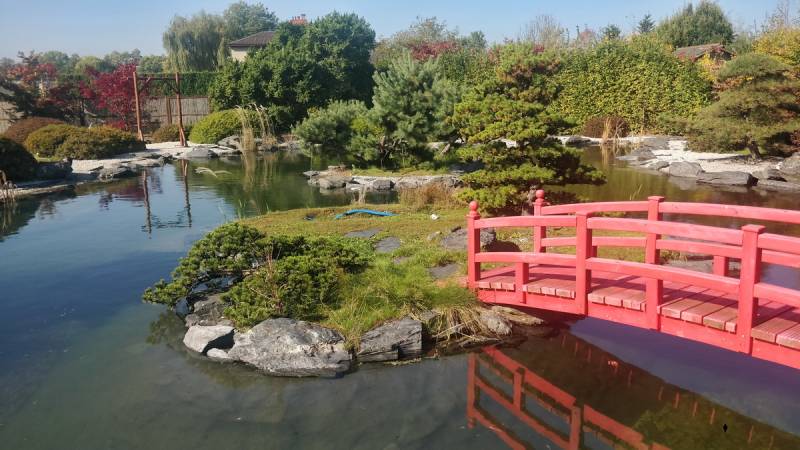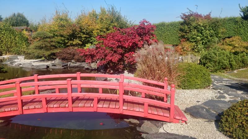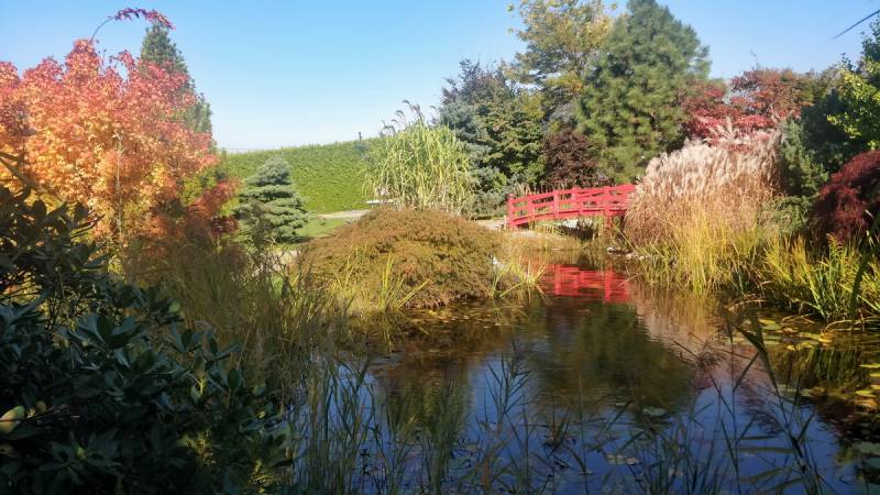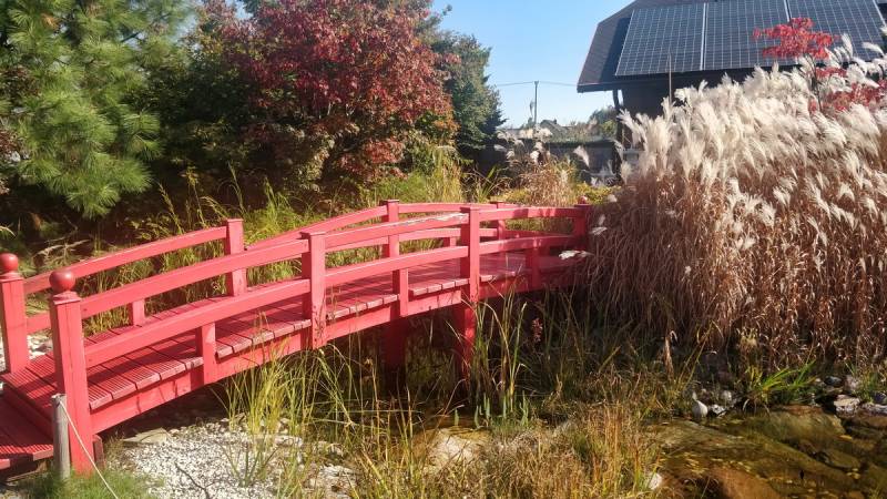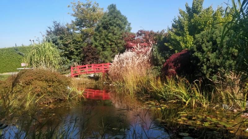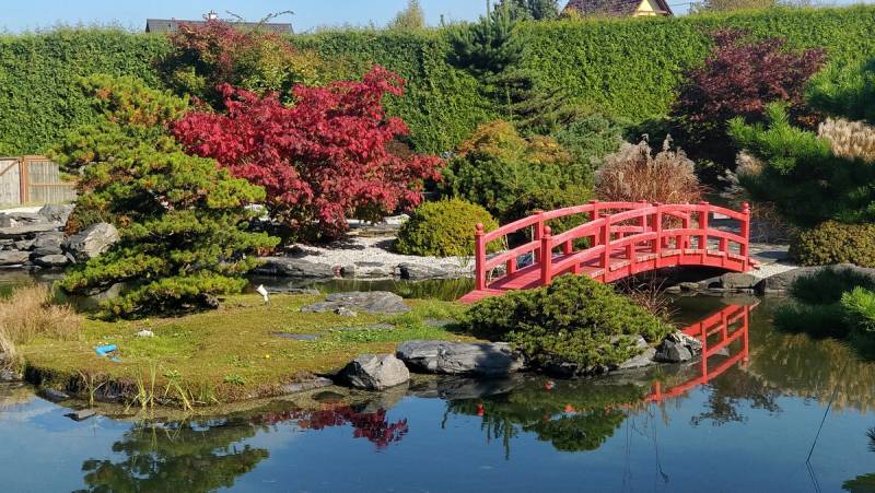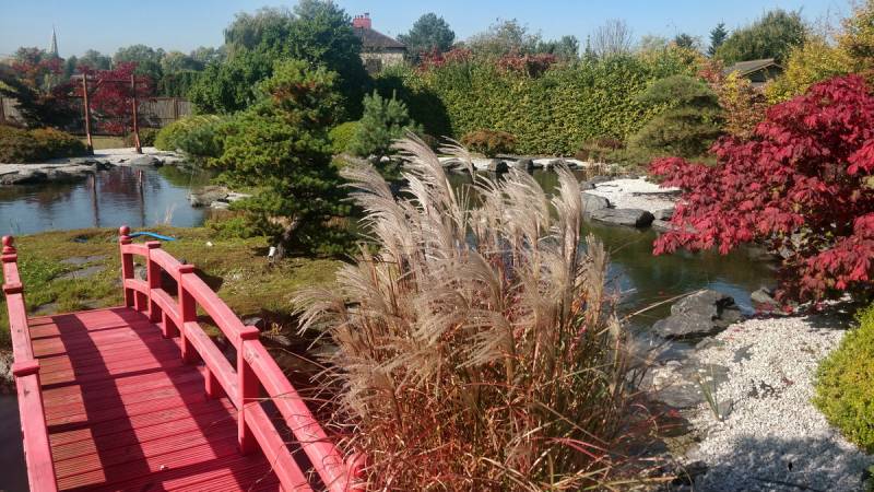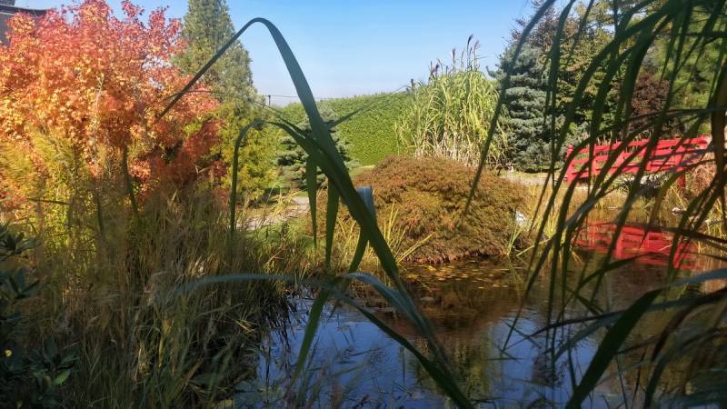 W lecie żarówkowate kolory, najmocniejszymi akcentami są czerwone mostki. Duży staw robi wrażenie - zwłaszcza krystalicznie czysta woda.