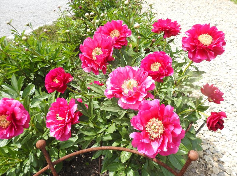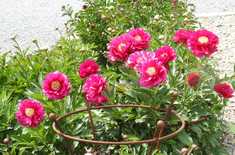 Kwiaty: do 18 cm, podwójne (4 do 5 rzędów płatków). Kolor trudny do określenia - początkowo jasnoczerwony w miarę rozwoju blednie do koloru czerwonego z odcieniem różowym. Środek "poduszka" z żółtych pręcików.