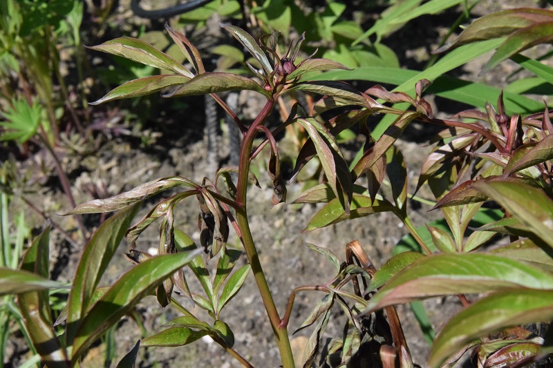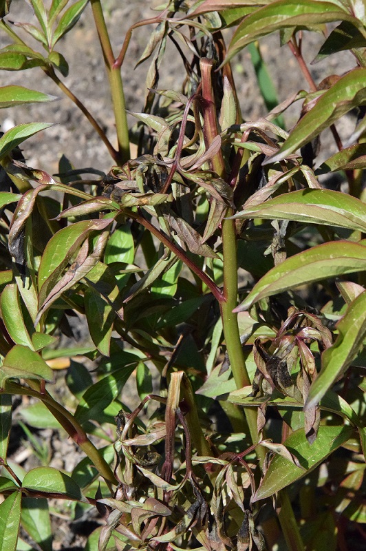 Gdy peonie wyjdą już na kilka centymetrów możemy prewencyjnie spryskać je środkiem grzybobójczym (miedzian, kaptan) co pomoże zapobiec zgniliźnie nasady pędów i szarej pleśni piwoniowej.