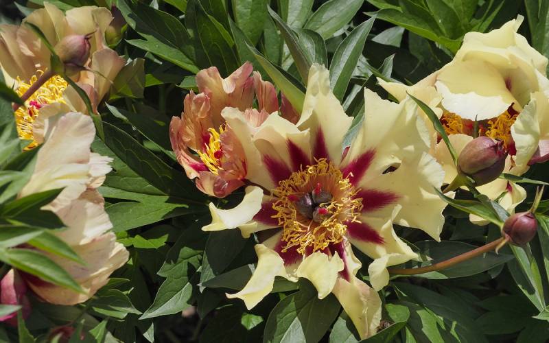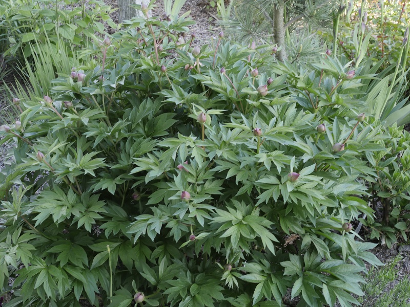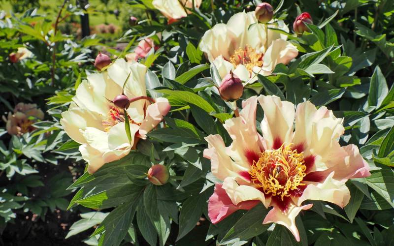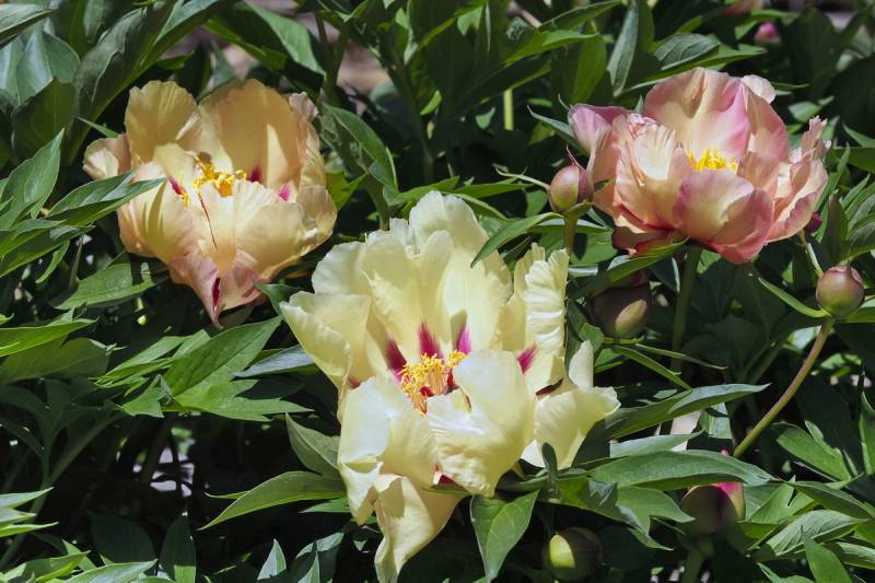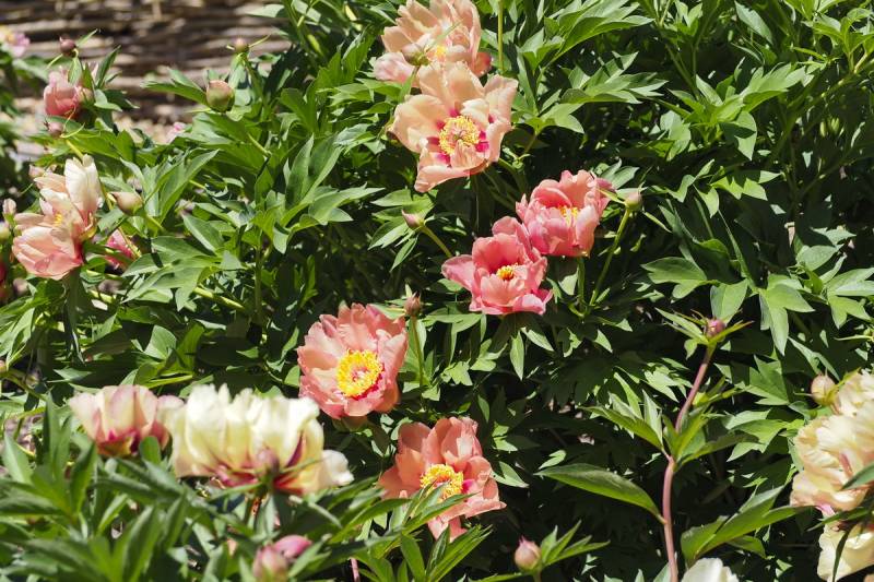 Piwonia Court Jester rozwija pierwsze kwiaty....