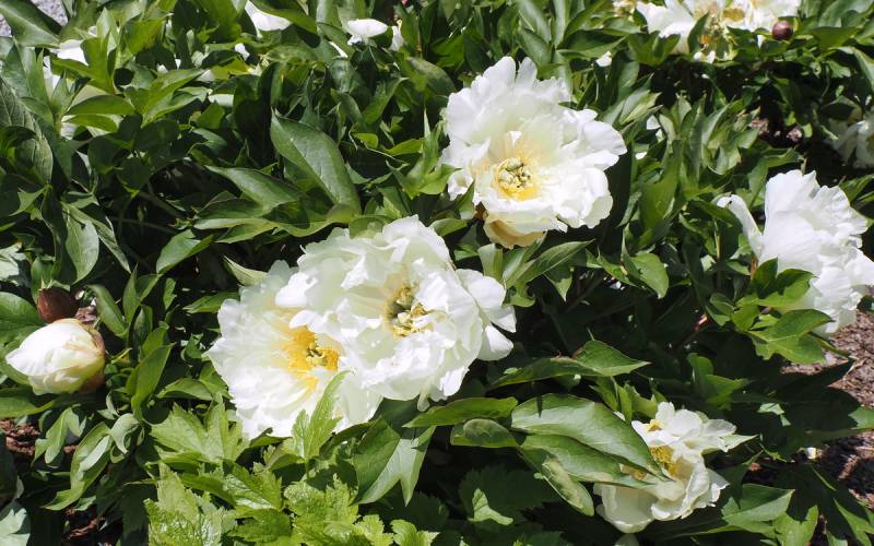 Hodowca: Seidl, USA, 1989 Kwiaty: białe, półpełne (Ø 18-20 cm) pręciki kremowe, słupki jasnoszare z kremowymi końcówkami Wysokość: około 60 - 70 cm Pędy: mocne, sztywne, krzew jako całość tworzy idealną roślinę ogrodową Liście: bujne ciemnozielone, mocno wcięte, sztywne; jesienią mogą się ładnie przebarwiać Termin kwitnienia: przełom maja i czerwca