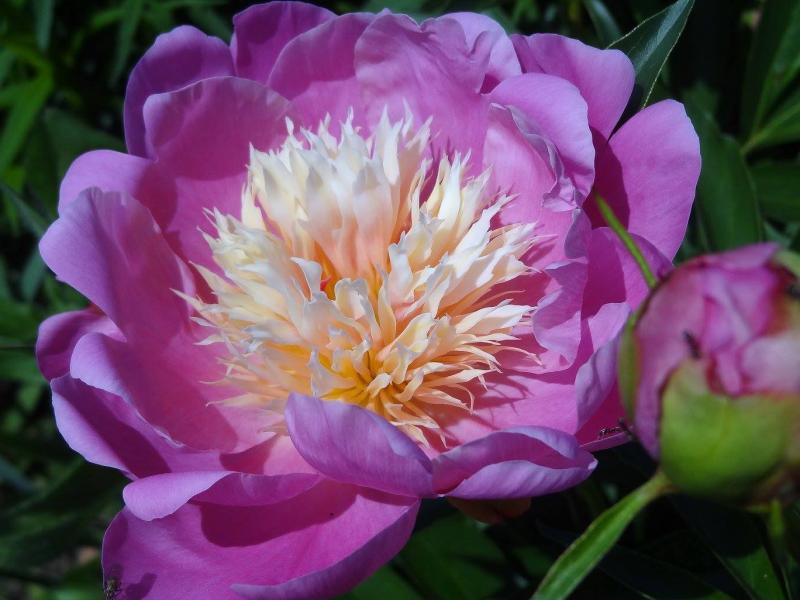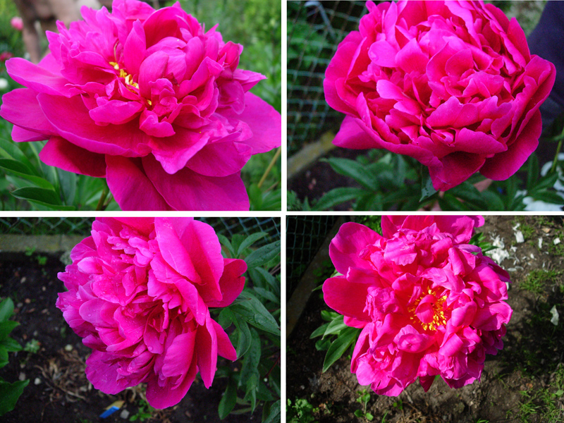 I jeszcze jedna peonia. Wydaje mi się, że taką samą ma Andrzej (post 1; fot. 6 i 7). Jest to też peonia wiśniowa, ale wręcz z odcieniem śliwkowym i charakterystycznym srebrzystym połyskiem. Pachnie, nie za mocno. Pędy bardzo silne - nie potrzebuje podpór. Trudno mówić o terminie kwitnienia, bo w tym roku to co kwitło przez miesiąc, przez upały trwało tylko 2 tygodnie. U mnie zakwitła pierwszy raz - od razu 5. kwiatami. Bardzo charakterystyczna jest gruba, gęsta "korona" złotych pręcików w środku i składa płatki w bardzo charakterystyczny, uporządkowany sposób. Swego czasu podejrzane były Karl Rosenfield lub Etienne Mechin. Proszę o sugestie pukpuk .