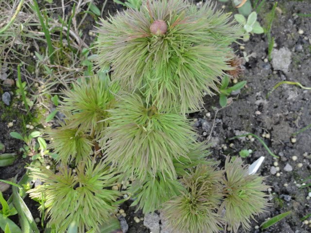 Peonia delikatna (Paeonia tenuifolia) z dnia na dzień coraz ładniejsza. Teraz zapewne przystopuje wzrost, bo zimno i pada śnieg :(