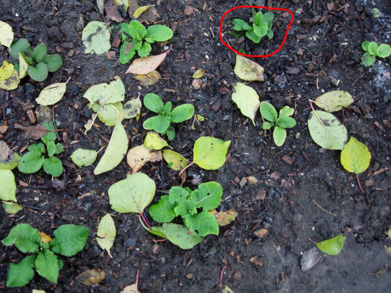 Tutaj mam siewki pierwiosnków striped blue. One też częściowo wywędrują. Może powinnam je zadołować w doniczkach, ale nie mam doświadczenia w uprawie doniczkowo-ziemnej, więc będą kopane wiosną. Te w kółeczku to raczej zostaną, bo były wsadzane do doniczki bardzo malusie (trzy, żeby doniczka nie stała pusta), jak widać nawet mączniak ich nie zmógł :kocham .