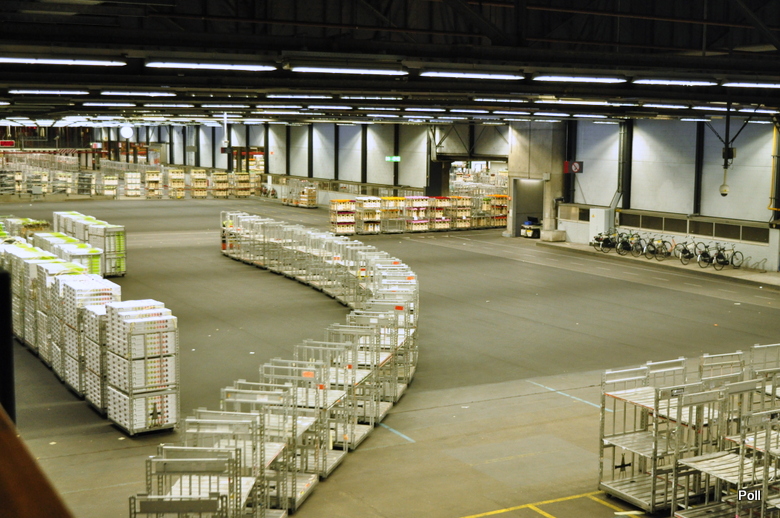Teren giełdy udostępniony został do zwiedzania ale odbywa sie ono z prowadzacego na piętrze odkrytego korytarza, aby nie zakłócać pracy. Na początek przechodzimy więc nad halami magazynowymi, gdzie składowane sa chwilowo niepotrzebne wozki. Sama powierzchnia hali i ilośc wózków daja do myslenia...Przecież to tylko chwilowo puste pojazdy...