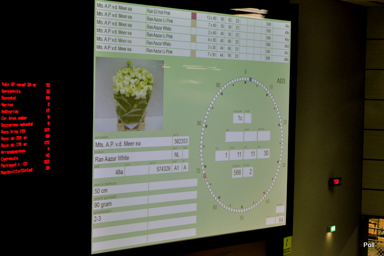 Zegary aukcyjne z proponowana i aktualną ceną kwiatów, oraz zapowiedziami, jakie kwiaty i od jakich producentów za chwile będą licytowane