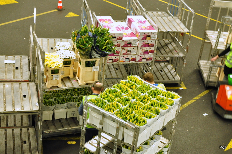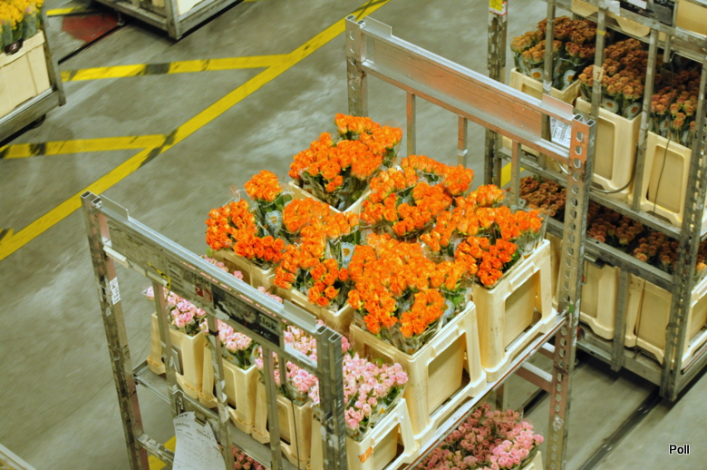 Zamówienia hurtowników przekazywane sa do hali na dole, gdzie pracownicy na wózkach gromadzą je i szykują do pakowania. To własnie miejsce najbardziej mnie zadziwiło. Setki wózków i praconików z słuchawkami na uszach precyzyjnie pobierają z miejsc magazynowania i dostarczaja na miejsce całe, długie sznury wózków wypełnionych kwiatami i zywymi dodatkami florystycznymi.