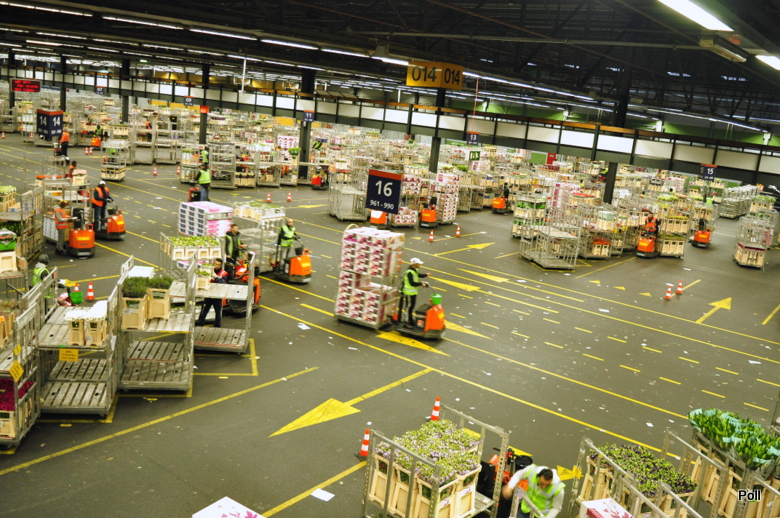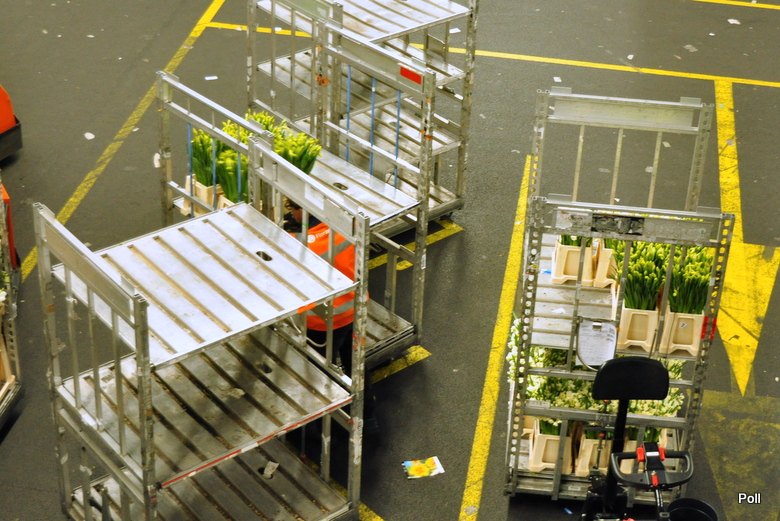 Zamówienia hurtowników przekazywane sa do hali na dole, gdzie pracownicy na wózkach gromadzą je i szykują do pakowania. To własnie miejsce najbardziej mnie zadziwiło. Setki wózków i praconików z słuchawkami na uszach precyzyjnie pobierają z miejsc magazynowania i dostarczaja na miejsce całe, długie sznury wózków wypełnionych kwiatami i zywymi dodatkami florystycznymi.