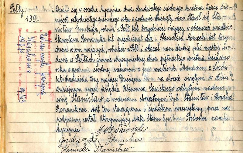 Betina, ale ja mam tylko skan tego aktu, oryginał jest w księdze w USC Myszyniec. Scan mam dzięki przemiłej Pani Kierownik, która mi go wysłała mailem, a powinnam sama tam pojechać i sobie zrobić zdjęcie bo do tego mam prawo, urzędnik nie jest zobowiązany do wykonywania scanów dokumentów, ale zdarzają się bardzo mili i uczynni urzędnicy, ja zawsze w różnych małych urzędach na takich trafiam. Nigdy mi nie odmówiono, czasami podpowiedziano lub potwierdzono pewne dane, choć tego też nie wolno. Genealogia bywa kosztowna i ja wydałam dużo pieniędzy w archiwach i urzędach za różne dokumenty i każda taka życzliwość jest dla mnie wyjątkowym gestem.