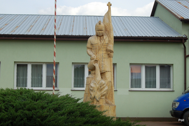 Figura św. Floriana (naturalnej wielkości) przed stanicą OSP w Woli Korytnickiej (woj, mazowieckie, pow. węgrowski). O tyle unikalna, iż pięknie wyrzeźbiona w drewnie. Do tej pory , w takich miejscach spotykałam 'rzeźby' z seryjnej produkcji- zazwyczaj odlewane z jakiś sztucznych mas. mur