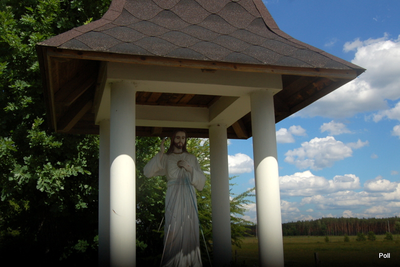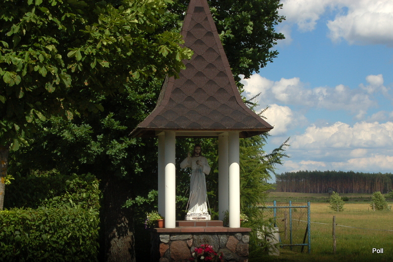 Figura Jezusa Miłosiernego stała przy drodze polnej, wśród pól uprawnych. Przy figurze odprawiano nabożeństwa czerwcowe. W latach 70-tych ubiegłego wieku, wytyczono nową drogę, ok. 5 metrów na południe od drogi polnej, a na polach wytyczono nowe działki. W ten sposób figura została wpisana w krajobraz działki, na której właściciel postawił nowy dom. Jezus stoi wpatrzony w dom i podwórko właścicieli, tyłem do drogi. Figura stoi do dziś, jest przez "właścicieli" odnawiana. Na próżno jednak mieszkańcy wsi proszą sąsiada, aby obrócił figurę przodem do drogi. Nie i już.