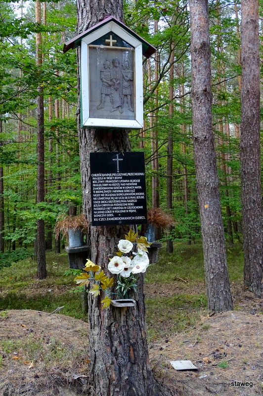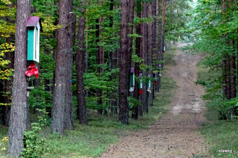 Pisząc o kapliczkach w lasach pomiędzy Budami Łańcuckimi a Żołynią wspomniałem o pewnej tajemniczej sprawie. Otóż, mniej więcej w połowie drogi pomiędzy kaplicą Św. Antoniego, a kaplicą Św. Huberta odchodzi droga leśna w kierunku Korniaktowa Płn. Przy tej drodze, na leśnym dukcie wiodącym na niewielkie wzgórze ktoś nieznany, wiosną 1992 r. umieścił kapliczki Drogi Krzyżowej. Są to kapliczki nadrzewne, rodzaj dużych pasyjek.