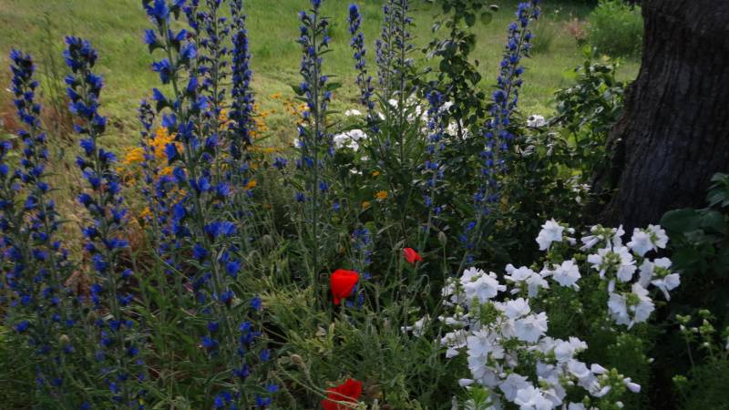 Kilka słów o orlayi. Róże w tym miejscu pomarzły, rabata zaczęła przekształcać się w łakę, a wraz z nią jest jeszcze wysiana dwa lata temu orlaya. Nie ma tu dla niej przyszłości jako rośliny łąkowej. Jeszcze jest, bo skorzystała z wcześniejszego pielenia.