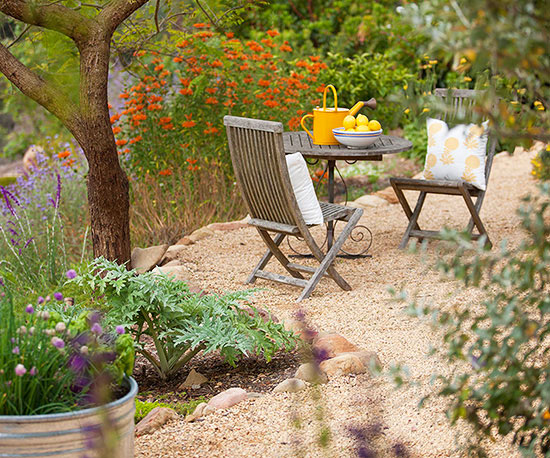 Jeśli masz w ogrodzie duże drzewa z gołymi, niezagospodarowanymi przestrzeniami pod nimi, wykorzystaj to miejsce dla stworzenia odkrytej przestrzeni życiowej. W tym małym ogrodzie, gdzie kilka rosnących drzew ogranicza założenie trawnika czy rabaty kwiatowej dodaj stół i krzesła.