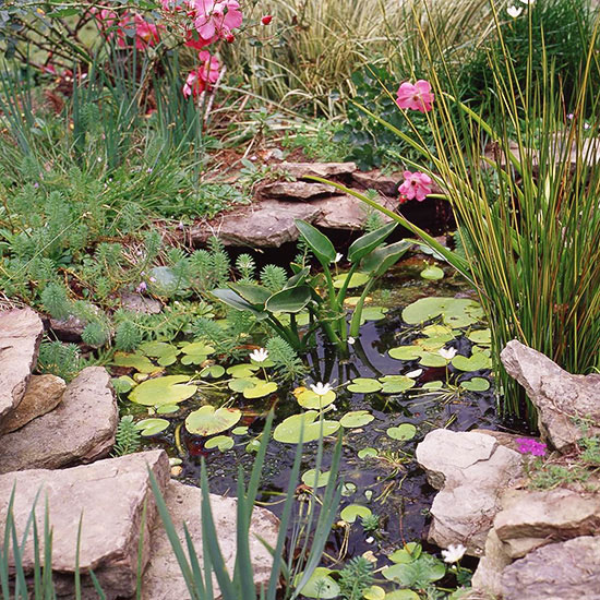 Nie trzeba ogromnego podwórka by mieć ogród wodny. W rzeczywistości, instalowanie nawet niewielkiego zbiornika wodnego jest świetnym sposobem, aby zagospodarować niskie lub wilgotne miejsca w ogrodzie. Wystarczy wykopać niewielki obszar, zabezpieczyć folią staw i wstawić pompę - i jesteś na najlepszej drodze. Nawet niewielka oaza wodna przyciągnie szeroką gamę kolorowych motyli i ptaków. W pokazanym ogrodzie, troszkę wody, niewielka lilia wodna (np. Nymphoides Humboldtiana), zapewnia kolor w niewielkiej przestrzeni.