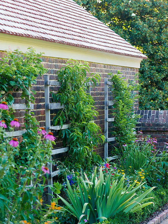 Jeszcze więcej kwiatów, a nawet warzyw w swoim małym ogrodzie można zyskać dodając kraty lub niskie podpory w poszczególnych zakątkach (czy przy ogrodzeniu, murze). W ten sposób można rozwijać uprawy winorośli w pionie, żeby nie przeszkadzały innym, sąsiadującym roślinom. W tej wąskiej części ogrodu, trzy drewniane kraty wspierają kwitnące pnącza.