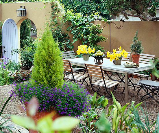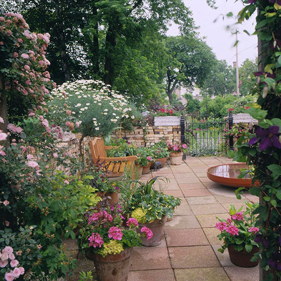 Stwórz swój własny zakątek raju sadząc swój mały ogródek w donicach i pojemnikach, przepełnionych kwiatami i pachnącymi ziołami. Na tym luksusowym podwórku, doniczki z pelargoniami oraz margerytkami zapewniają duże ilości koloru otaczającego ławeczkę. Duża terakotowa misa niczym niewielki basen z błyszczącą taflą wody jest także miejscem kąpieli dla ptactwa.