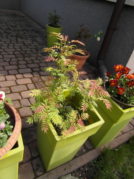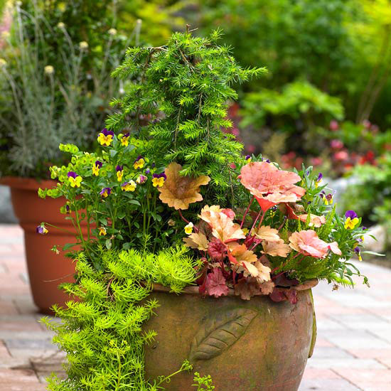 Wczesną wiosną, na długo przed rozkwitem barw ogrodu, Brian ustawia pojemniki, które większość sezonu cieszą jasnymi liśćmi i subtelnymi fakturami. Jakaś bylina o pokroju płaczącym, do tego Euphorbia lub dwie. Do tego Żurawka (np. "Marmalade"), po której następuje smuga Sedum (np. "Angelina"). "Z liśćmi takimi jak te, kto potrzebuje kwiatów?" mawia. No, a kwiatów takich jak fiołki można dodać do ozdoby wiosennych sałatek.