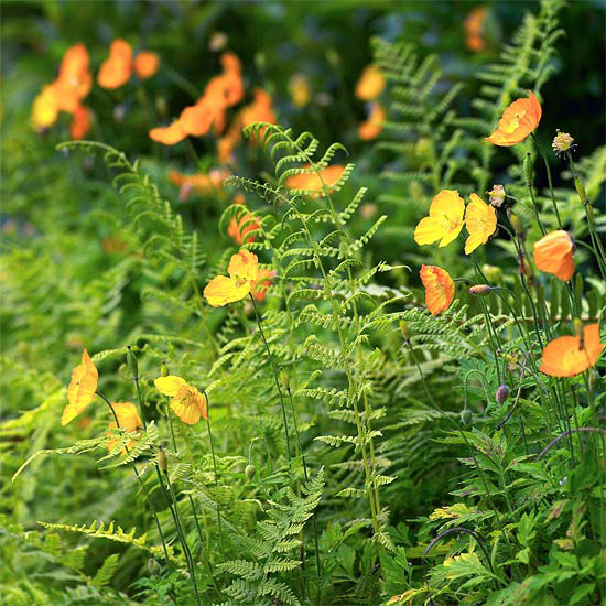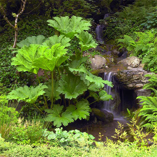 Wielka, rozłożysta Gunnera czuje się jak w naturze nad zalesionym strumieniem i wodospadem, dodaje dramatyzmu i stwarza obraz w ogrodzie. Brian używa wielkich bylin wieloletnich - do zmiany skali rzeczy, to coś na podobieństwo dodania wieżowca do panoramy miasta. Tawułki i tulejniki ("kapusta skunksa") podkreślają i uzupełniają scenę.