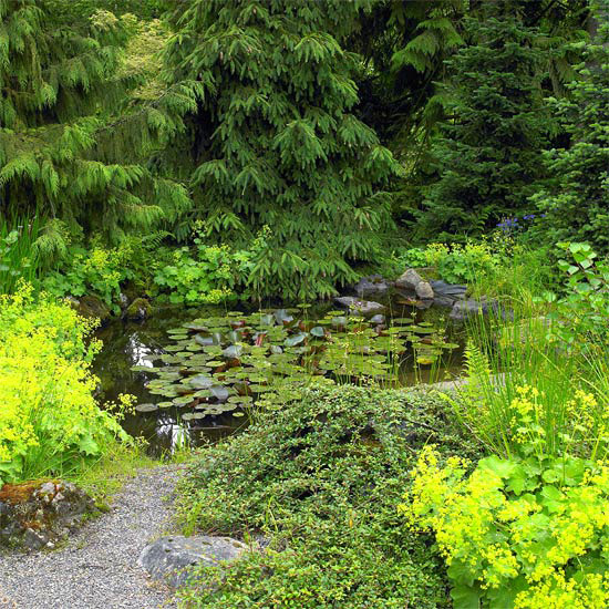 Brian stworzył alpejski staw jakby wykuty na wzgórzu, gdzie żaby i ropuchy dołączają się do chóru ptaków, chętnie chlapiących się w płytkiej wodzie. "Sztuką jest, praca z ustawieniem i kompozycją tak, by staw i nasadzenia miały naturalny wygląd," mówi Brian. W tym przypadku stwarza to płaszcz irgi na pierwszym planie i alpejskie jodły oraz cyprys nutkajski w tle.