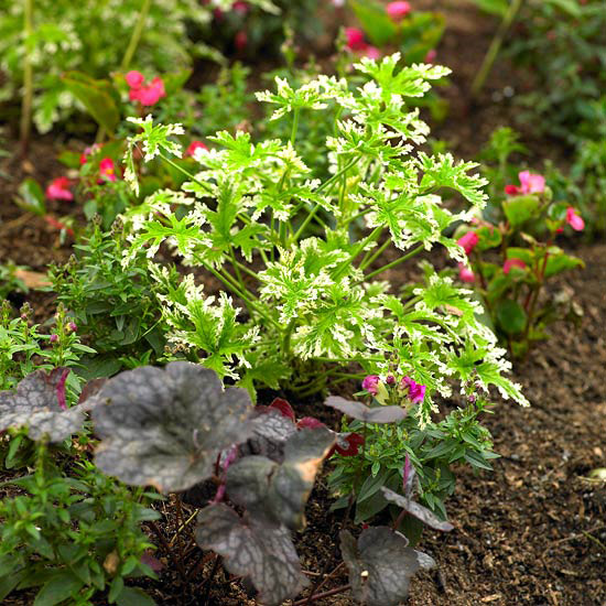 Niezależnie od tego, że odstrasza komary, Brian lubi barwne pachnące geranium (Pelargonium citrosum). Dzięki jakby zmrożonym-białym końcówkom liści, "świeci jak latarnia" na obrzeżach rabaty. "Zwykła forma zielona zniknie", mówi Brian. "Użyj barwnych roślin, które zamieszają rzeczy." Plusem jest cytrynowy zapach, obdarowujący przechodzących doznaniami sensorycznymi.