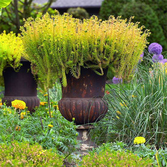 Można stworzyć sensację umieszczając jedną wspaniałą roślinę w spektakularnej donicy. Brian robi to z Sedum 'Angelina' w 90 cm wysokości pordzewiałym gazonie. "To jest elegancja w prostocie," mówi. "Ludzie mają tendencję do zbyt skomplikowanych nasadzeń kontenerowych." Brian lubi to złote słońce, soczyste, tolerujące upał i suszę. Roślina popisze się zmiennością koloru od wiosny, przez lato do jesieni (zielony, żółty, bursztynowo-pomarańczowy).