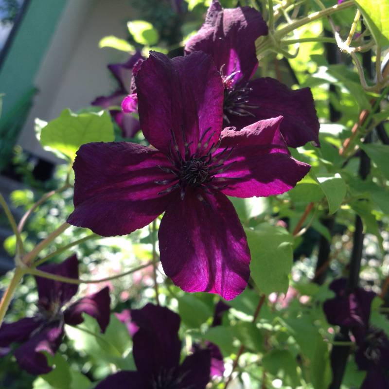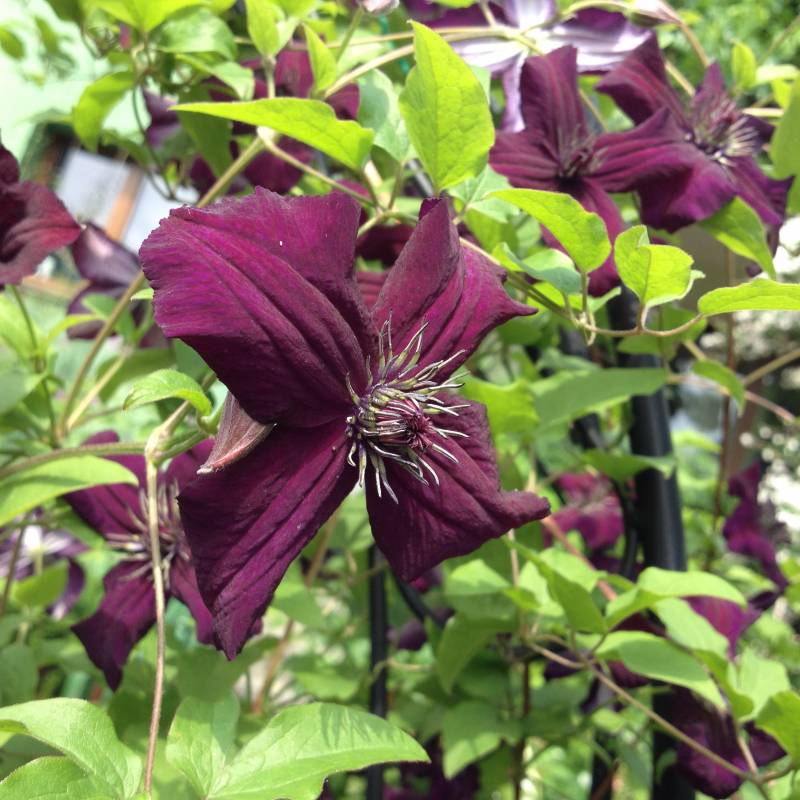 Kwiaty: Niezbyt duże, ok. 6-8 cm, bardzo ciemne, ciemnopurpurowo-fioletowe z zielonymi pręcikami i ciemnofioletowymi pylnikami, działki o brzegach lekko pokręconych. Kwitnie od VI do VII i słabiej do IX.