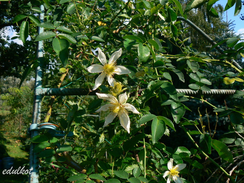 W pierwszym roku rósł w donicy i ładnie spinał się na płotek, posadzony do gruntu walczył o miejsce z sąsiadującymi różami, liczę że da radę bo kwiatuszki ma śliczne.