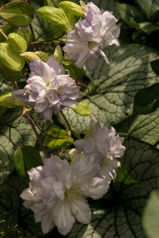 Kwiaty: biało niebieskie, kuliste, po rozwinięciu półpełne, śr. 10-12 cm. Kwitnie obficie VI-VII, powtarza słabo w VIII.