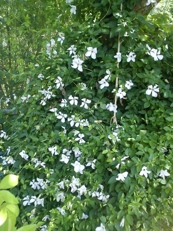 Kwiaty: średnie, ok 6 cm, białe z zielonymi, lekko zdeformowanymi wierzchołkami, kwitnie obficie VII i mniej intensywnie do jesieni