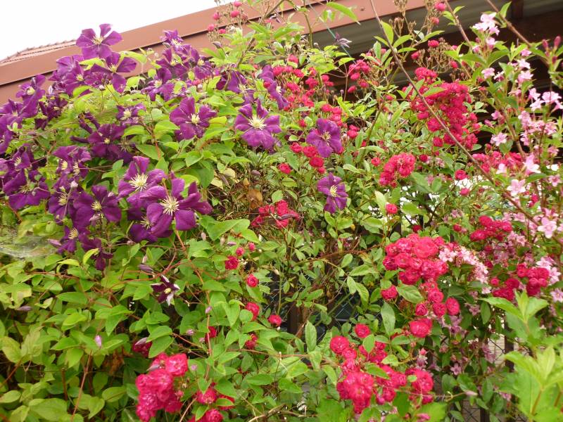 Od dwóch lat tnę powojnika 'Etoile Violette' dwa razy w roku. Wiosną i zaraz po kwitnieniu. Nie zwracam szczególnej uwagi na wysokość cięcia, ponieważ jest bardzo poplątany z różą. Obie rośliny tnę tak, żeby uwolnić domofon, który po pierwszym kwitnieniu jest całkiem zasłonięty obfitością pędów.