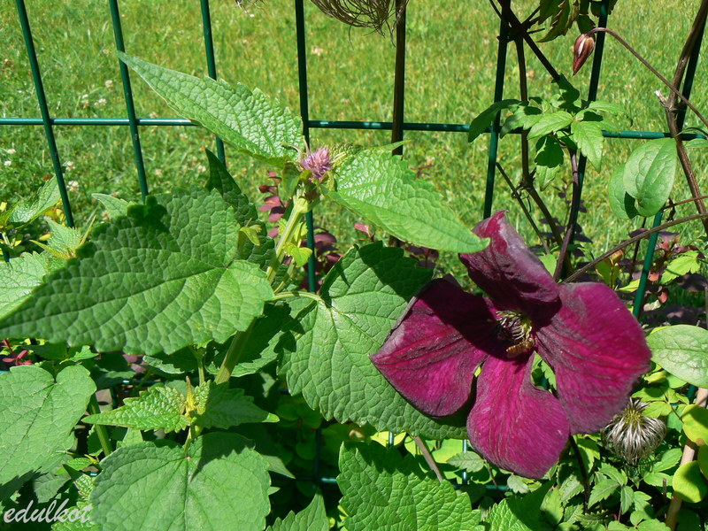Kwiaty: średniej wielkości, średnica 7 cm, aksamitne, ciemnoczerwone, z pylnikami o podobnej barwie, kwitnie obficie VII-IX