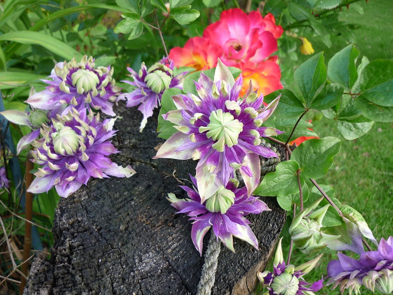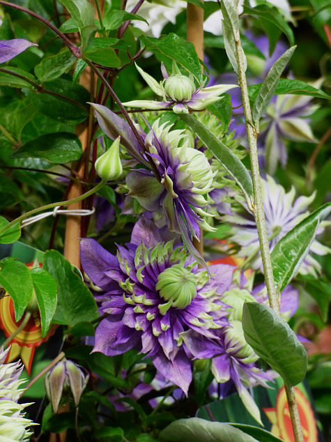 Kwiaty: pełne, fioletowoniebieskie z żółtozielonymi końcami działek... zmienne w kształcie... średnica powyżej 12 cm... kwitnie VI-IX