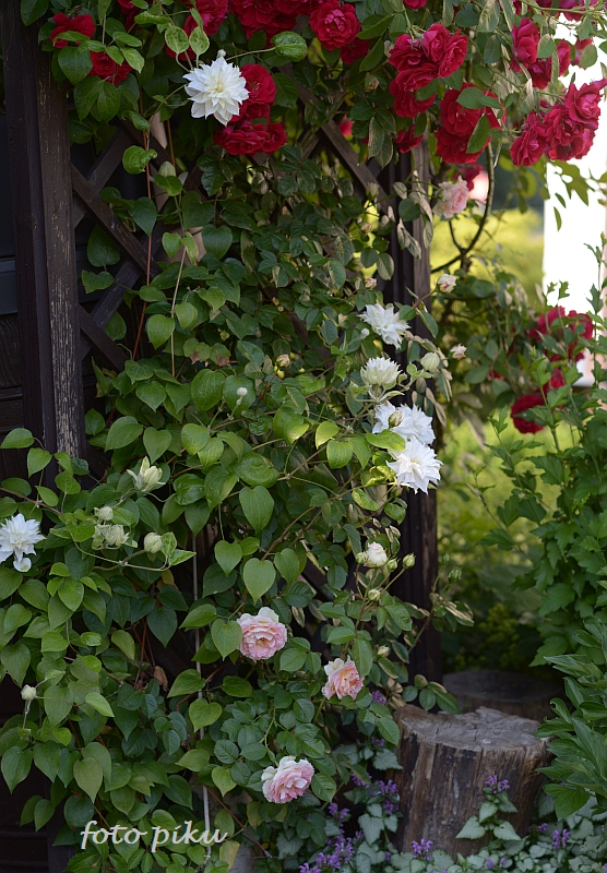 Powojnik 'Maria Skłodowska Curie' w urokliwej kompozycji z różami w ogrodzie Agi Zawszewiosny