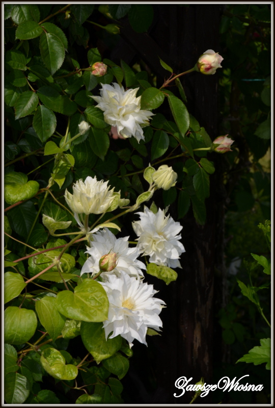 Tymczasem starszy, rozpięty na wiązie variegata, rozpoczął kwitnienie a w kolejce czeka jeszcze dużo zawiązanych pąków