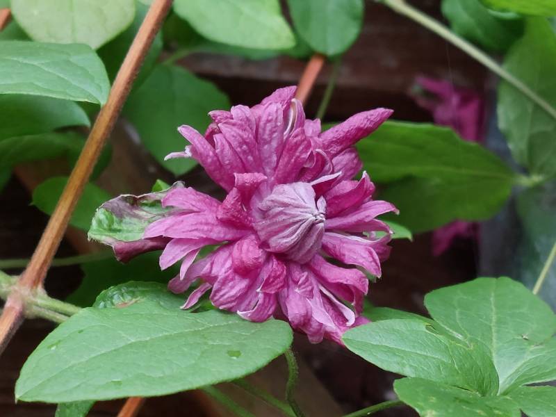Kwiaty: bordowe, zawsze pełne, małe, o średnicy 6˗8 cm, złożone z 4˗6 większych działek zewnętrznych i licznych wewnętrznych, węższych i krótszych. Na zewnątrz działki są matowe, jasne, różowoszare, po rozwinięciu wyginają się na zewnątrz. Kwitnie obficie w VII i słabiej do IX