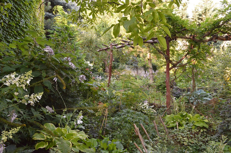 pod okapem orzecha włoskiego, który nie jest uważany za dobre sąsiedztwo dla bylin, choć ja nie odnotowuję jakichś problemów związanych z substancjami zawartymi w liściach. Korona drzewa została prześwietlona i skorygowana tak, aby poprawić statykę.