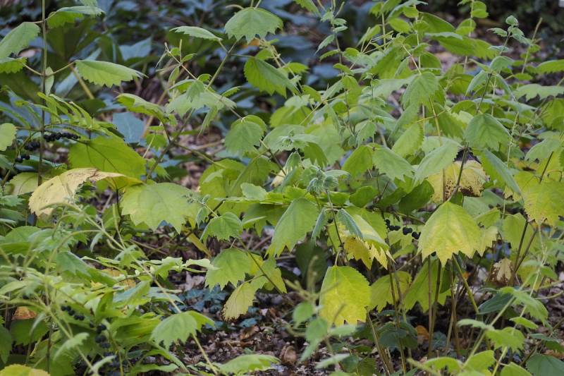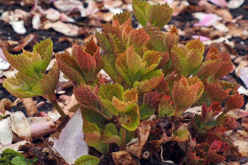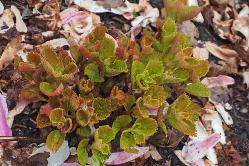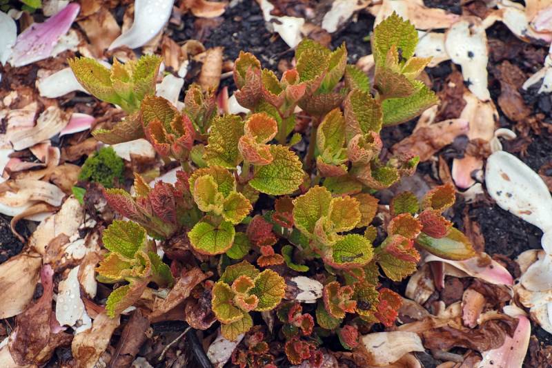 i osadzone na czerwono podbarwionych ogonkach. Roślina tworzy efektowne, gęste kępy. Jesienią liście pięknie się przebarwiają na żółto-złociste barwy.