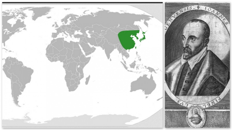 Zasięg występowania gatunku Pinellia i portret Giovanni Vincenzo Pinelli