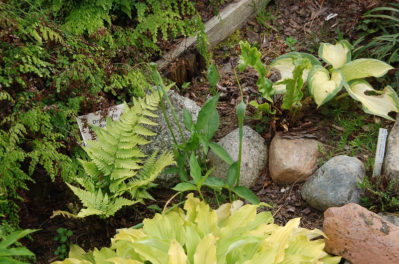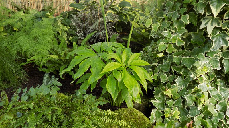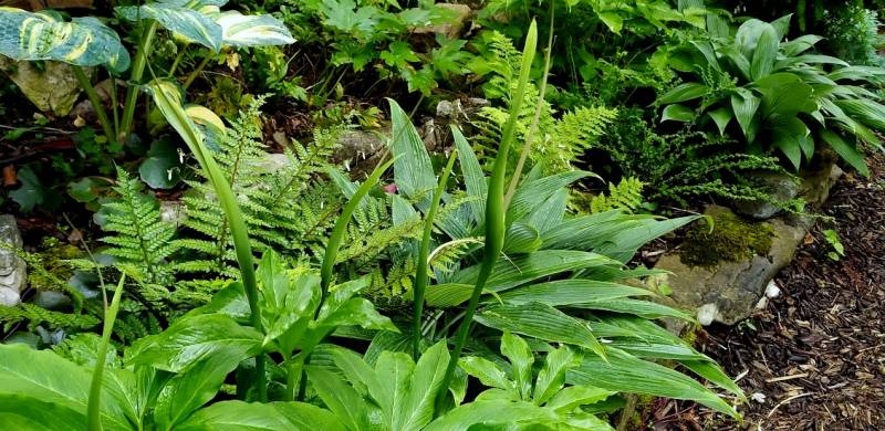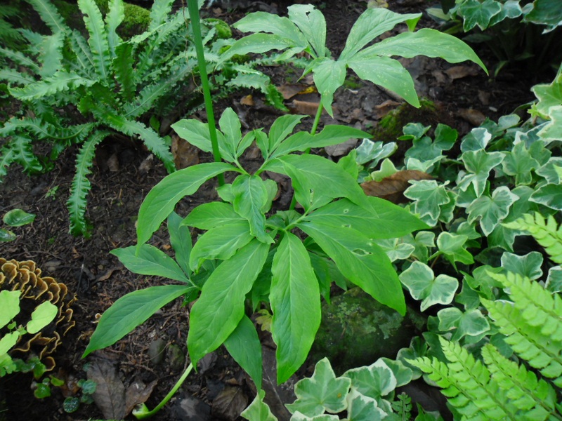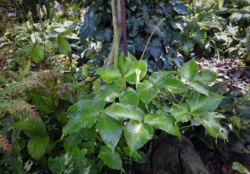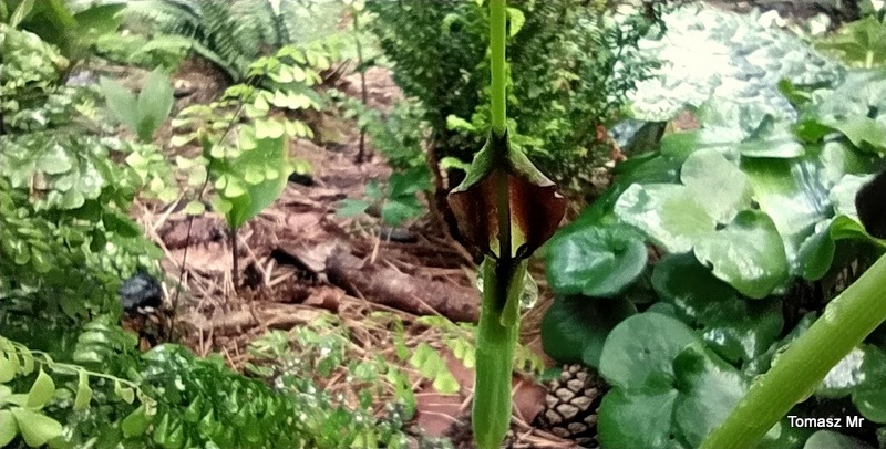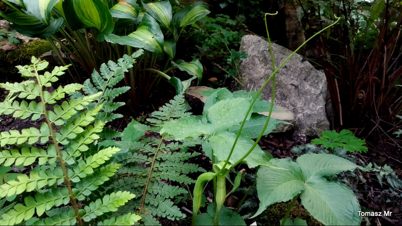 Kwitnienie Pinellia pedatisecta . W tle Polystichum setiferum 'Herrenhausen'.