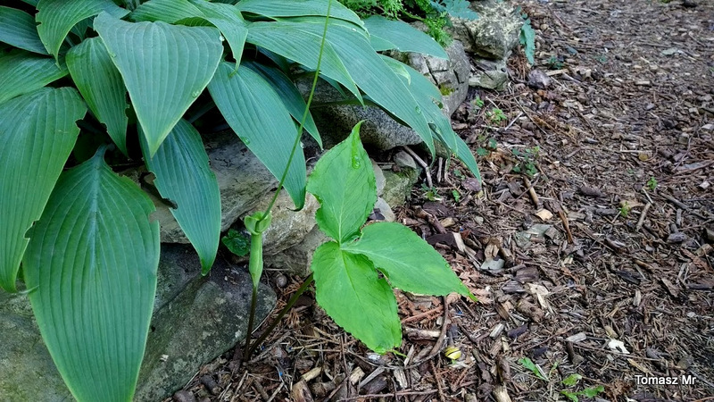 Pinellia tripartita (od Tomasza :buziak ) rośnie w świetlistym cieniu, pod starą jabłonią. Daje spory samosiew, ale z tego na razie się cieszę, bo chcę ją przenieść na nowe stanowiska.