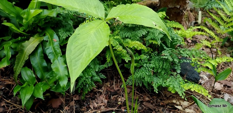Ciekawa, sterylna hybryda Pinellia tripartita i Pinellia cordata. Widać, że po obydwu odziedziczyła cechy.