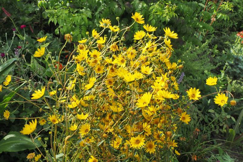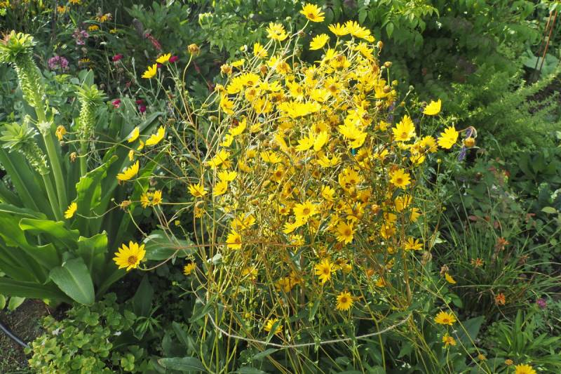 Kwiaty: kwitnie od czerwca do września. Kwiatostany występują zwykle pojedynczo na łodydze. Koszyczki kwiatostanów żółte, o średnicy do 50 mm,