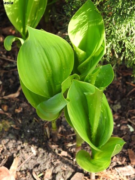 Liść: duży ok. 30cm, ciemno zielony z niebieskawym nalotem. Otoczka nieregularna, wiosną jasno zielona, z czasem żółto kremowa