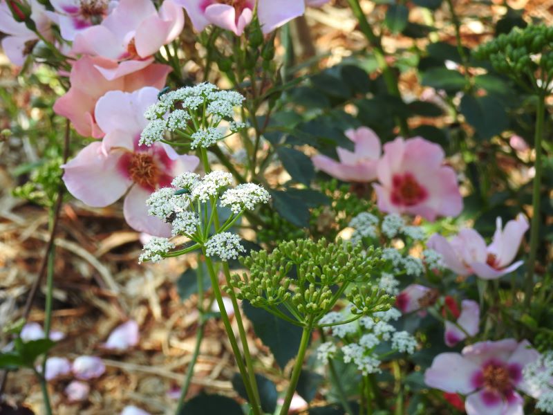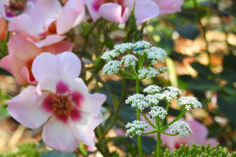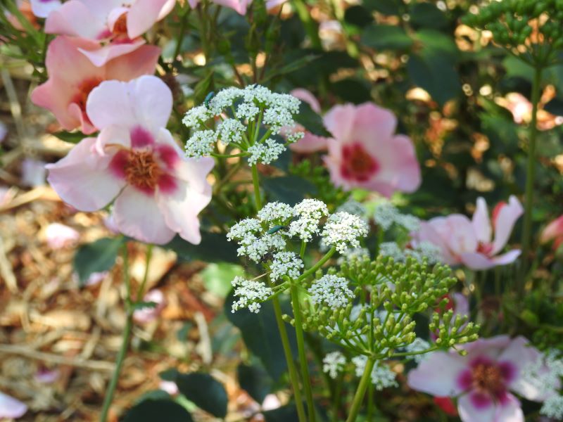 Kwiaty: drobne, białe, zebrane w baldachogrona. U mnie ładnie komponuje się z różą