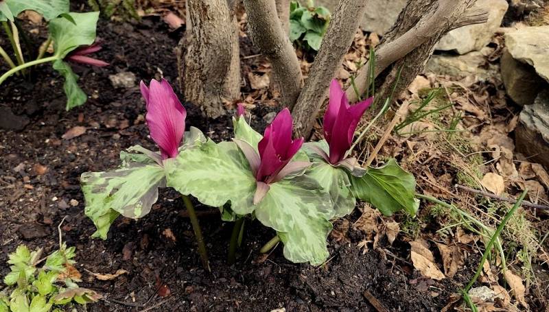 Budzi się Trillium chloropetalum. Stanowisko wiosną ma słoneczne, później półcień.