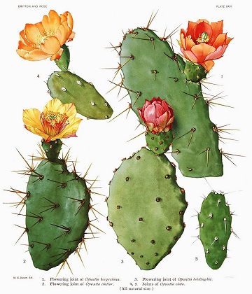 Rycina przedstawiająca kwitnące gatunki opuncji (z książki The Cactaceae/Britton et Rose, Vol. I), oraz owoc opuncji figowej (Opuntia ficus-indica)
